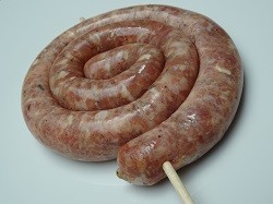 Saucisse 100% pur veau avec épice "kebab". Présentée en forme de serpentin sur un pique à brochette. A griller au barbecue ou à la poële.